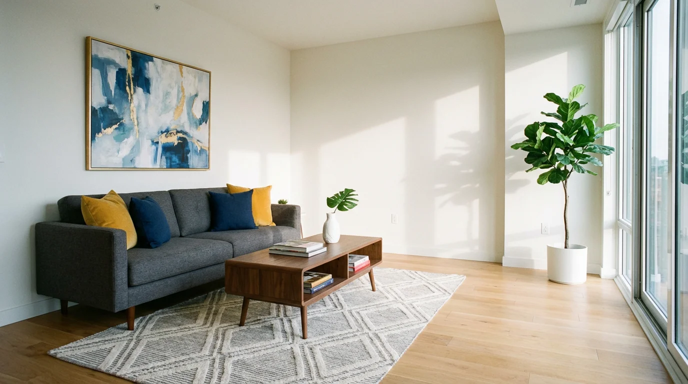 For the best results, upload a clear, well-lit photo of your apartment taken from a straight-on angle. In your text prompt, be specific about the style, colors, furniture, and mood you want to create. For example, instead of 'modern living room,' try 'modern living room with a navy blue accent wall and a brown leather sofa.'