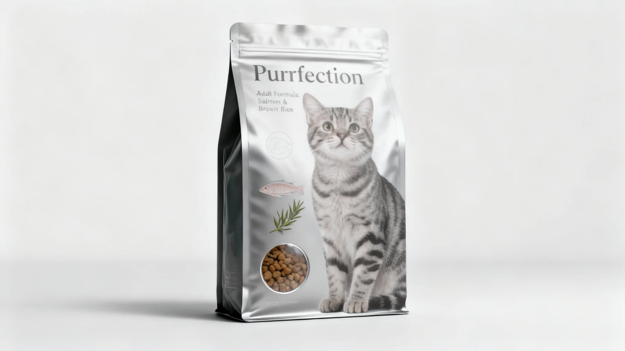 For the best results, be as specific as possible. Include the brand name, product name (e.g., 'Kitten Formula'), key ingredients to illustrate (like 'salmon' or 'chicken'), desired colors, the style (e.g., 'playful' or 'premium'), and any text you want on the bag. The more detail you provide, the better the AI can match your vision.