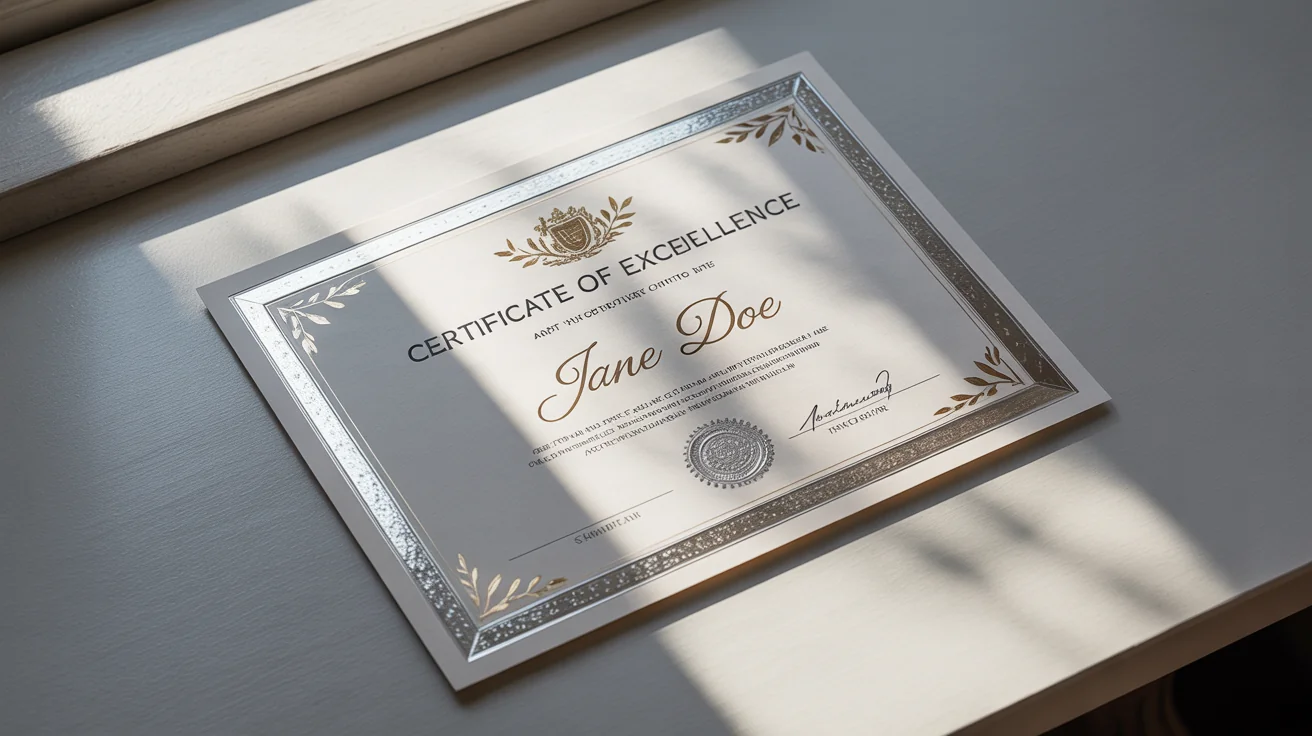 For the best results, be as descriptive as possible. Include the award title, recipient's name, style (e.g., 'vintage,' 'modern,' 'elegant'), color palette, and specific elements like 'gold foil lettering,' 'ornate silver border,' or 'a formal seal at the bottom'.