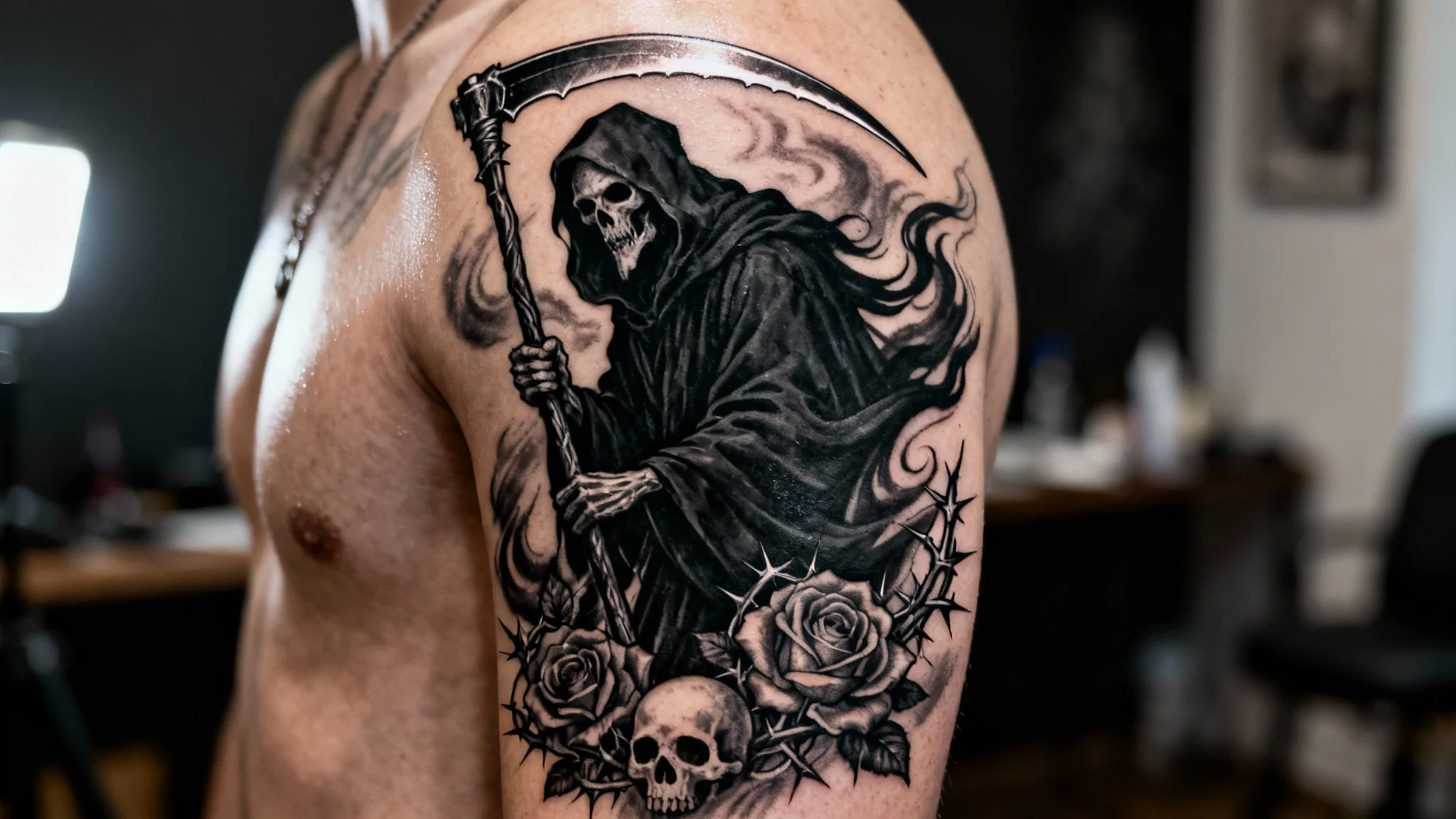 Write a prompt detailing your Grim Reaper design. Include elements like skulls, roses, the scythe, and the style you prefer, such as 'blackwork' or 'realism'.