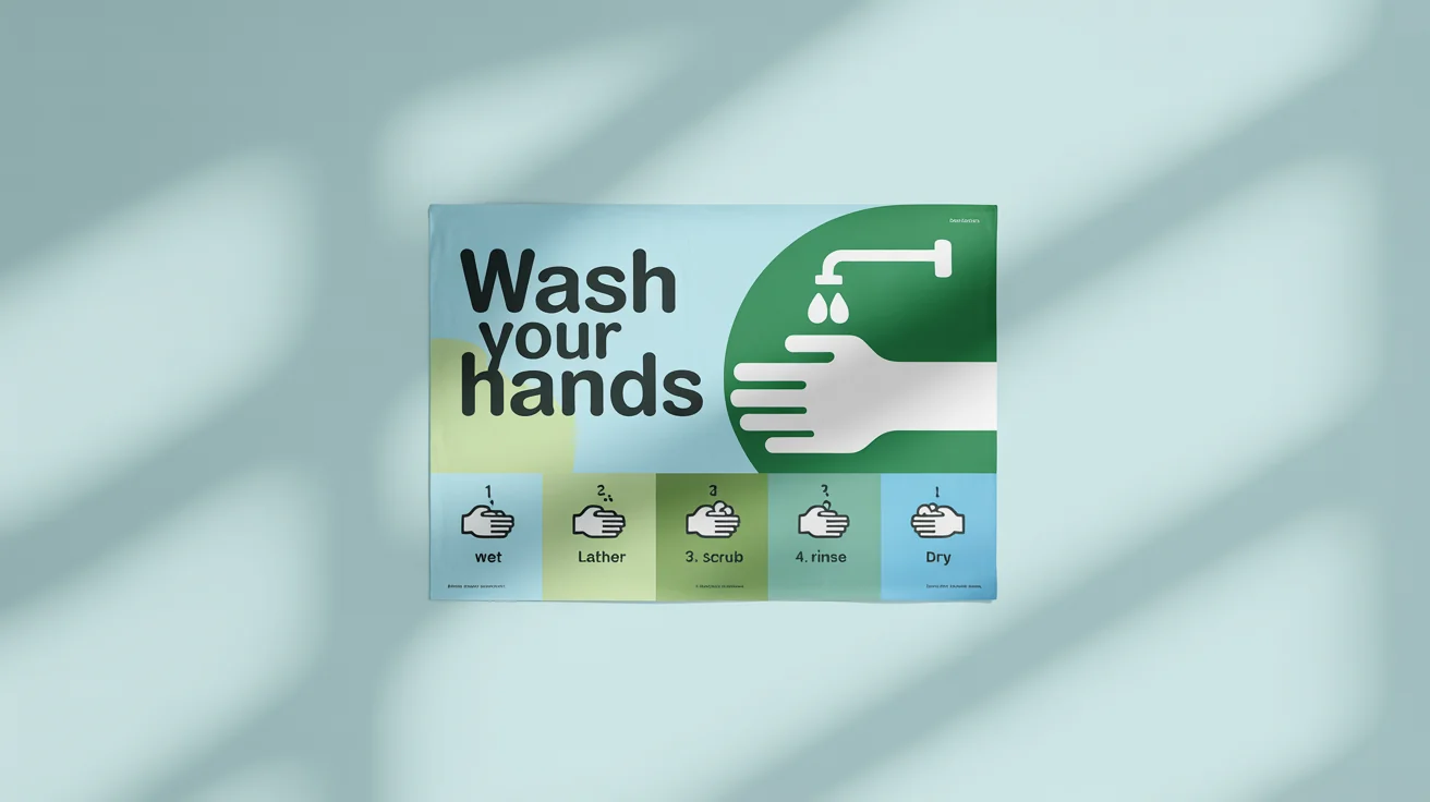 A good handwashing poster should include clear, simple instructions, often with visual icons for each step. Key steps include wetting hands, applying soap, scrubbing for at least 20 seconds, rinsing, and drying thoroughly. You can also include text reminders like 'Wash Your Hands' or 'Employees Must Wash Hands'.