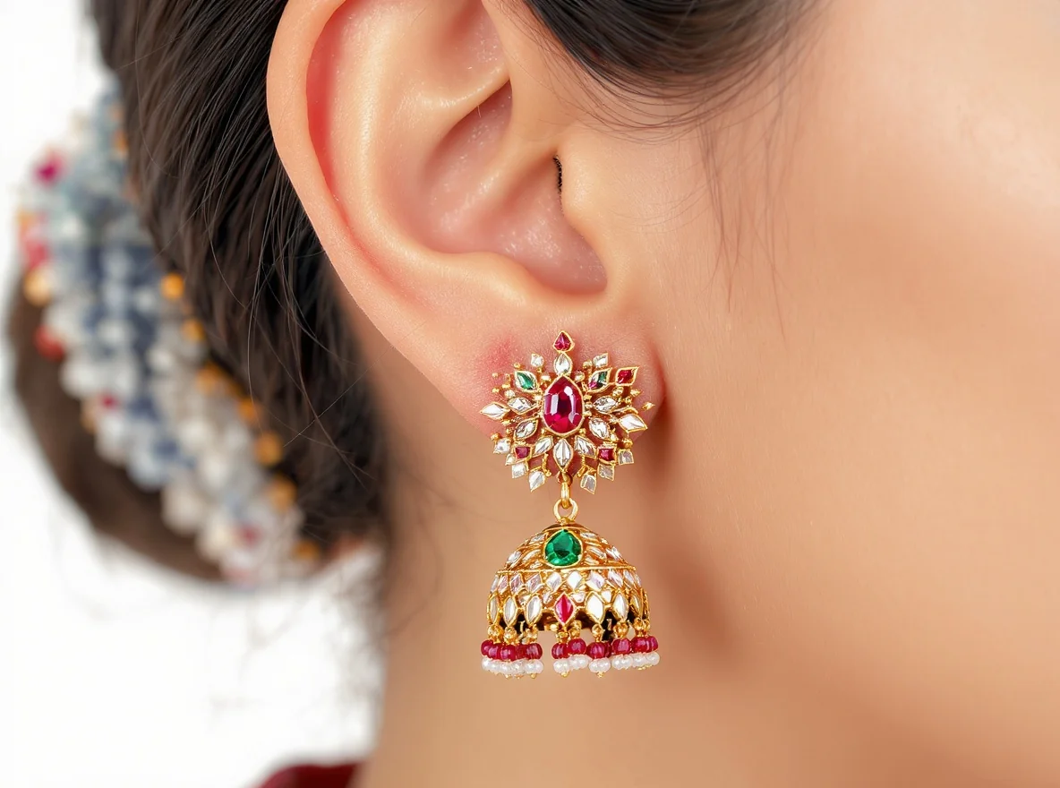 Enter a detailed prompt describing your earring and style. For example: Close-up of a woman’s ear wearing gold hoop earrings with soft lighting on a white background.