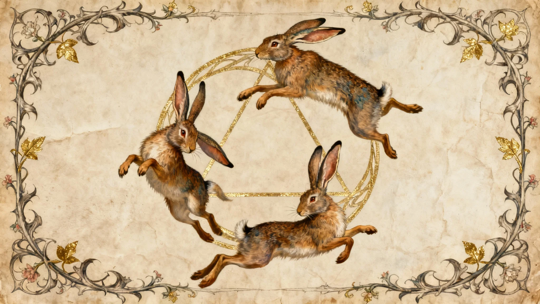 The three hares symbol is a circular motif showing three hares chasing each other. Its defining feature is a visual puzzle: while each hare appears to have two ears, there are only three ears in total, with each ear being shared by two hares. This symbol is found in sacred and historical sites across Europe and Asia.