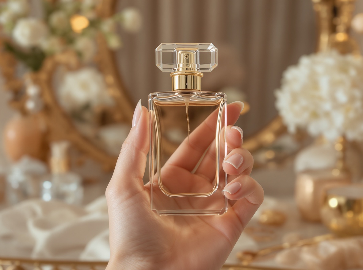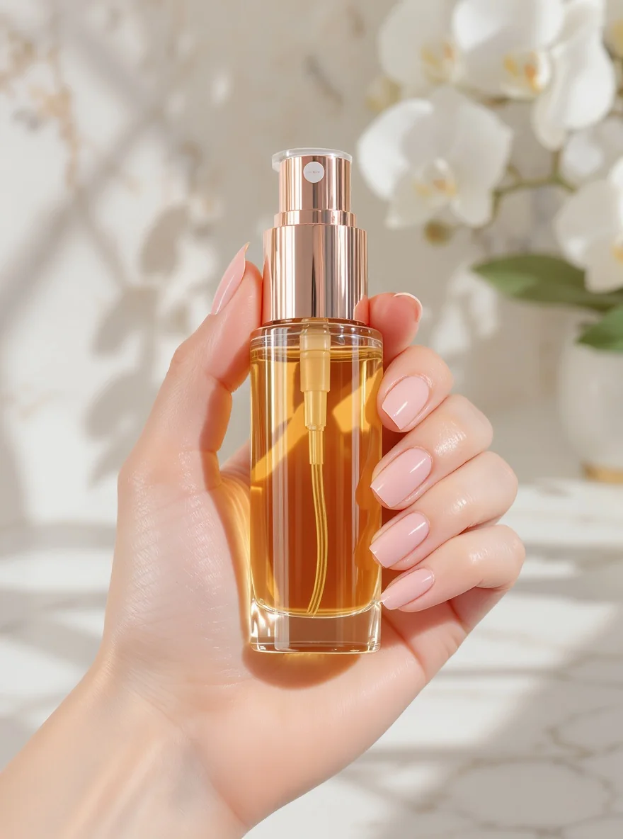 Type a sentence describing the desired scene. For example: "A woman's hand holding a glass perfume bottle with soft sunlight and a blurred garden background." The AI uses this to generate the image.